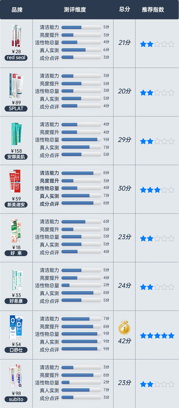 使用巴氏刷牙法2分钟后,各品牌清洁力如下: