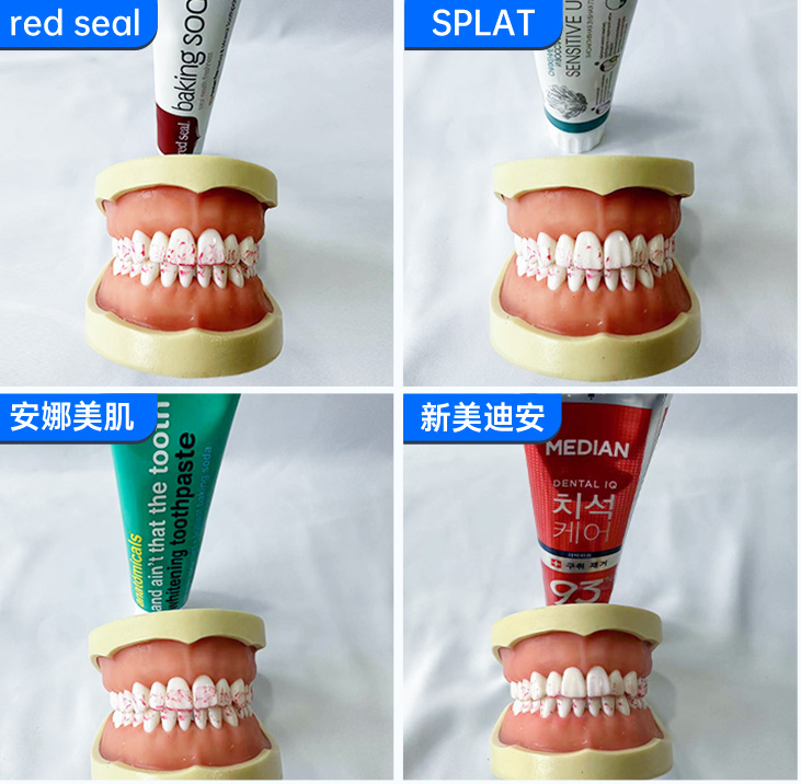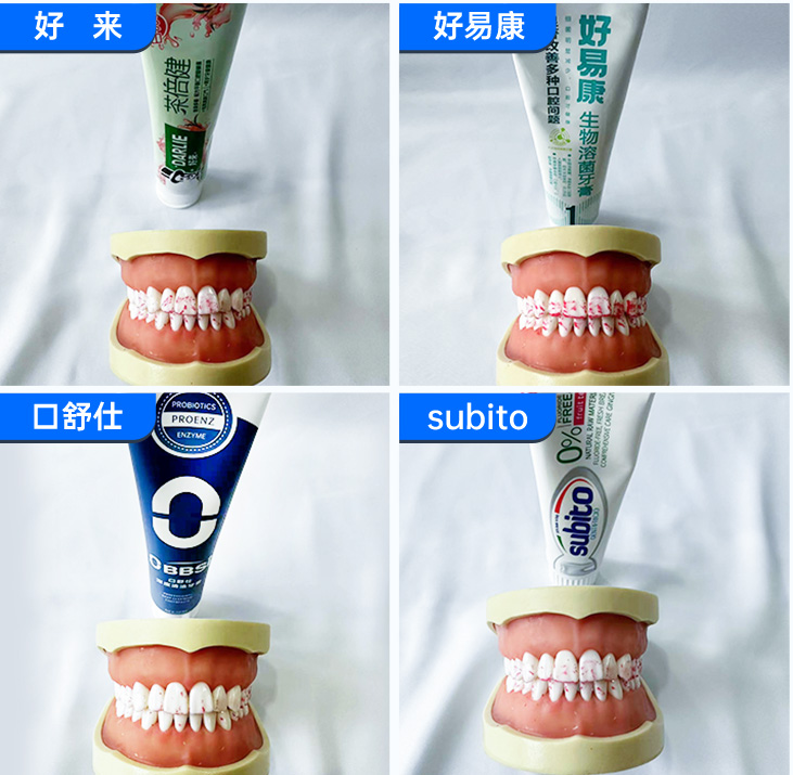 清洁力是牙膏重要的指标之一,这次我们在牙齿模型上涂上牙菌斑显色剂,用巴氏刷牙法刷2分钟,观察各品牌牙膏的清洁能力。