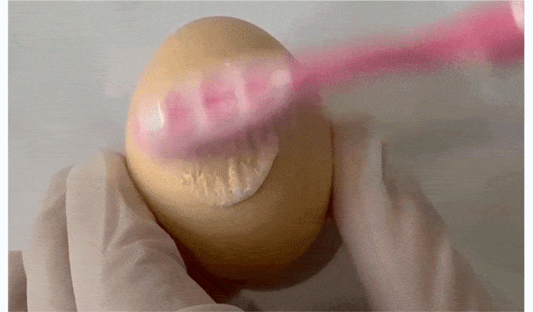 在咨询了专业人士后,我们采用和牙齿成分相同的鸡蛋壳来模拟本次持续净化能力。
